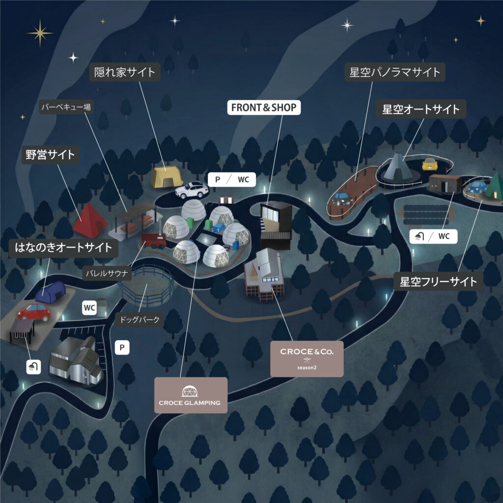 CROCEグランピングへは、お車でのご来場が便利です。施設周辺には駐車場を完備しており、快適にお越しいただけます。最適なルートについては、以下にご案内しておりますので、ぜひお車でのアクセスをご利用ください。