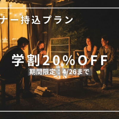 18歳以上の学生限定・学割20%OFFのお得なグランピングプラン。
